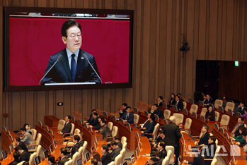 이재명 더불어민주당 대표가 10일 오전 국회에서 열린 본회의에서 교섭단체 대표연설을 하고 있다.