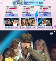 지드래곤이 에서 3주 연속 1위를 차지했다. 지드래곤은 29일 오후 생방송으로 진행된 SBS 에서 1위 후보에 오른 카라 [숙녀가 못돼], 소유&매드클라운 [착해 빠졌어]를 제치고 [삐딱하게]로 트리플크라운을 달성했다. 1위 발표 후 지드래곤은 “YG 패밀리와 부모님