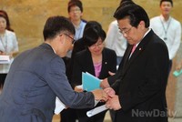 2일 오전 여의도 국회에서 열린 민주당 의원총회장 입구에서 통합진보당 의원들이 입장하는 민주당의원들에게 인사하며 이석기 구명을 위한 유인물을 나누어 주고 있다.