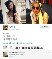 빅뱅 지드래곤과 미쓰에이 수지의 트위터 대화가 공개돼 화제다. 수지는 3일 자신의 트위터에 “블랙(Black) 노래 좋다. 블랙 블랙한 게”라는 글을 남기며 지드래곤의 신곡 [블랙]을 깨알 홍보했다. 이를 본 지드래곤은 수지에게 “그럼 사”라고 쿨한 답변으로 웃음을 자
