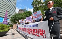 <라이트코리아>,<비전 21 국민희망연대>,<(사)실향민중앙협의회 평양시민회> 등 보수단체들이 16일 오후 서울 중구 태평로 파이낸스빌딩 앞에서 기자회견을 가졌다.이날 기자회견을 통해[불법천막농성]을 벌이고 있는 민주당 등이[국정원 해체