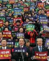 ▲ (서울=연합뉴스) 서울역 광장에서 한국자유총연맹 주최로 열린 '북 개성공단 가동중단 철회 촉구 기자회견'에서 참석자들이 손팻말을 들고 구호를 외치고 있다. 2013.4.11지난 4월8일 북한이 개성공단 가동을 잠정 중단하고,북한 근로자들을 모두 철수시겠다고 발표했다