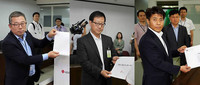 ▲ 주파수 경매 신청서를 접수한 이통 3사(왼쪽부터 LGU+ 강학주 상무, SKT 이상헌 상무, KT 이석수 상무).ⓒ연합뉴스2일 이통 3사 모두 미래창조과학부에 주파수 경매 신청서를 제출하면서 본격적인 주파수 전쟁이 시작됐다.LG유플러스는 지난 1일 오후 가장 먼저