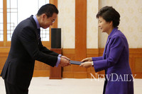 박근혜 대통령은 23일 권영세 주(駐)중국 대사 등 신임 대사 4명에게 신임장과 임명장을 수여했다. 안호영 주미국 대사와 이병기 주일본 대사, 이시형 주경제협력개발기구(OECD) 대표부 대사 또 함께 신임장을 받았다.이들 신임 대사는 지난 3~4월 내정돼 주재국 동의(