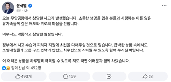 직무정지 중인 윤석열 대통령이 무안공항 제주항공 참사와 관련해 애도의 뜻을 표했다. 국회에서 탄핵소추안 가결 이후 처음으로 SNS에서 입을 연 것이다.윤 대통령은 29일 자신의 페이스북에 "오늘 무안공항에서 참담한 사고가 발생했다"며 "소중한 생명을 잃은 분들과 사랑하