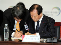 △ 최성재 고용복지분과 간사가 14일 서울 삼청동 한국금융연수원 내 대통령직 인수위원회에서 열린 고용노동부 업무보고에 앞서 강석훈 국정기획조정분과 위원과 이야기를 나누고 있다. ⓒ 인수위 고용노동부는 14일 대통령직 인수위원회 업무보고에서 고용률 70%를 달성을 국정