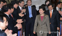 박근혜 대통령 당선인은 31일 새누리당 의원총회를 찾았다.15년 의정생활의 마지막 의원총회 참석이었다. 박 당선인이 국회 의원총회장에 입장하자 박수 갈채가 쏟아졌다. 소속 의원들은 약속이나 한 것처럼 모두 자리에서 일어나 기립한 채에서 새로운 대통령을 맞았다. 박 당선