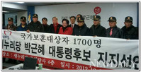 국가보훈 대상자 1700명이 박근혜 새누리당 대선 후보를 지지 선언했다.‘조국의 안위를 걱정하는 국가보훈대상자 1700보훈가족’은 6일 새누리당 당사에서 기자회견을 갖고 다음과 같이 밝혔다.“제18대 대선을 13일 남겨둔 현재 우리 국가보훈대상자 일동은 준비된 여성대통