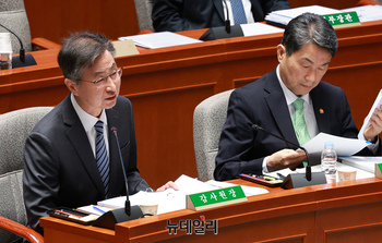 김용현 국방부 장관이 14일 오전 국회에서 열린 예산결산특별위원회 전체회의에서 의원 질의에 답하고 있다.