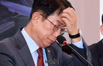 박상우 국토교통부장관이 13일 오전 국회에서 열린 국토교통위원회 전체회의에서 얼굴을 만지고 있다.