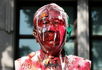 동대여대 설립자 조용각 전 이사장 흉상이 13일 남녀공학 전환에 반대하는 학생들에 의해 만신창이가 돼 있다. 동덕여대 학생들은 대학 측의 남녀공학 전환 논의에 거세게 반발하며 수업을 거부하고 반대시위를 이어가고 있다.