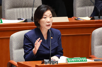오영주 중소벤처기업부 장관이 11일 오전 국회에서 열린 예산결산특별위원회 전체회의에서 의원질의에 답하고 있다.