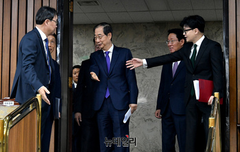 한덕수 국무총리, 한동훈 국민의힘 대표, 이진우 대한의학회장이 11일 오전 국회에서 열린 여·야·의·정 협의체 1차 회의에 참석하기 위해 입장하고 있다.