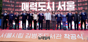 오세훈 서울시장, 김병주 MBK파트너스 회장, 부인 박경아씨, 이성헌 서대문구청장 등 참석자들이 4일 서울 서대문구 북가좌동에서 열린 서울시립 김병주도서관 착공식에서 기념촬영을 하고 있다. '김병주 도서관' 이름은 도서관 건립비용 절반인 300억원을 기부한 김