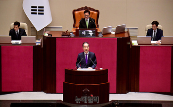 한덕수 국무총리가 4일 오전 국회에서 열린 본회의에서 2025년도 예산안 및 기금운용계획안에 대한 시정연설을 하고 있다.