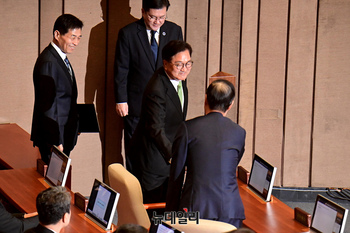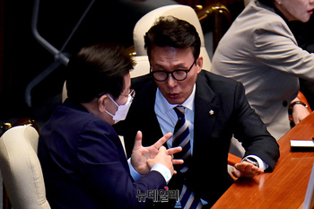 이재명 더불어민주당 대표 와 김민석 최고위원이 4일 오전 국회 본회의장에서 열린 2025년도 예산안 및 기금운용계획안에 대한 시정연설에 참석해 대화하고 있다.
