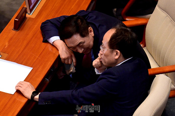 추경호 국민의힘 원내대표와 김기현 의원이 4일 오전 국회 본회의장에서 열린 2025년도 예산안 및 기금운용계획안에 대한 시정연설에 참석해 대화하고 있다.