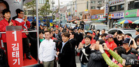서울 성동구의 가장 큰 재래시장인 금남시장이 29일 오전 내내 들썩였다. 불과 20분 전까지만 해도 민주통합당 최재천 후보가 유세를 벌였던 금남시장 삼거리에 박근혜 새누리당 선대위원장이 등장했다. 노란 물결 일색이던 일대는 순식간에 붉은빛으로 바뀌었다. 성동갑 김태기
