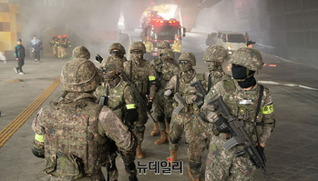 2024 서울시 재난대응 안전한국훈련이 열린 30일 오전 서울 중구 동대문디자인플라자에서 군 장병들이 다중밀집시설 화재상황 대응 훈련을 하고 있다.