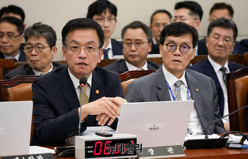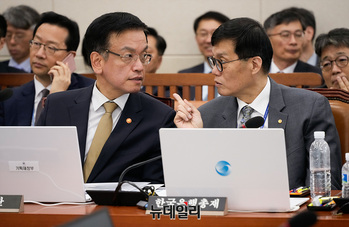 최상목 경제부총리 겸 기획재정부 장관이 29일 오후 서울 여의도 국회에서 열린 국회 기획재정위원회의 기획재정부, 한국은행 등에 대한 종합감사에서 이창용 한국은행 총재와 대화를 나누고 있다.