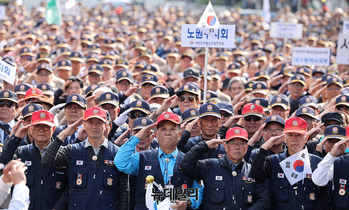 대한민국월남전참전자회 회원들이 28일 오후 서울 종로구 동화면세점 앞에서 열린 북한정권의 러시아 파병을 규탄하는 궐기대회에서 거수경례를 하고 있다.