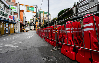 핼러윈 데이를 앞둔 25일 오후 서울 용산구 이태원역 주변에 인파 관리를 위한 경찰 안전펜스와 현수막이 설치돼 있다.서울시는 이태원, 홍대, 성수 등 인파 밀집이 예상되는 서울 시내 15개 지역에서 25일부터 11월 3일까지 '핼러윈 중점 안전관리 기간'을 운영한다.