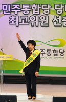 15일 오후 경기도 일산 킨텍스에서 진행된 민주통합당 당대표 및 최고위원 선출대회에서 민주통합당 새 지도부로 선출된 한명숙 대표가 기뻐하고 있다.야권 통합정당 출범 후 첫 개최된 이번 전당대회는 80만 명 규모의 선거인단이 참여하는 메머드급 국민참여 경선으로 진행됐으며