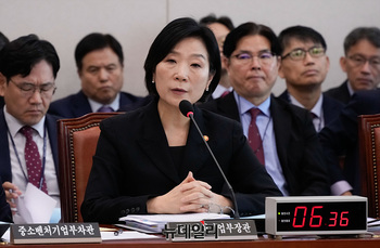 오영주 중소벤처기업부 장관이 25일 오전 서울 여의도 국회에서 열린 국회 산업통상자원중소벤처기업위원회의 중소벤처기업부 등에 대한 종합감사에서 중소벤처기업부, 특허청 등에 대한 종합감사에서 의원들의 질의에 답하고 있다.