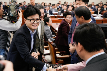한동훈 국민의힘 대표가 24일 오후 서울 여의도 국회에서 열린 국회 환경노동위원회의 환경부, 기상청에 대한 종합감사에서 인사를 나누고 있다.