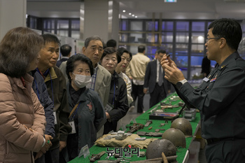 국방부유해발굴감식단 관계자가 24일 인천 카리스호텔에서 열린 인천·경기 지역 6·25 전사자 유해발굴사업 설명회에서 유가족들에게 전시된 발굴 사진과 유품을 설명하고 있다. (사진=유해발굴단)