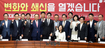 한동훈 국민의힘 대표와 추경호 원내대표 등 참석자들이 23일 오전 국회에서 열린 확대당직자회의에 앞서 기념 촬영을 하고 있다.