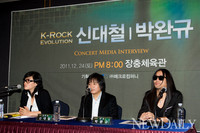 5일 오후 2시 서울 서초구 반포동에 위치한 팔레스 호텔에서 ‘K-Rock Evolution 신대철-박완규’ 서울공연의 기자회견이 열린 가운데 연출은 맡은 김민정 갑독과, 가수 박완규, 기타리스트 신대철이 공연에 대해 설명을 이어가고 있다.한국 록을 이끄는 두 록커와