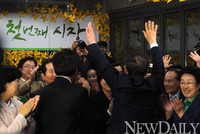 26일 오후 8시 지상파 3사 재보선 출구조사에서 박원순 무소속 후보가 한나라당의 나경원 후보를 앞선 것으로 집계되자 박 후보가 뒤로 돌아서 지지자들을 향해 만세를 외치고 있다.우측에 박수를 치고 있는 한명숙 전 총리의 모습도 보인다.이날 출구조사 결과, 박원순 후보는