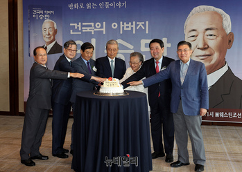 황선우 산학연종합센터장(왼쪽부터), 김황식 전 총리, 강창희 전 국회의장, 김종인 전 의원, 조혜자 여사, 박주선 발간위원장, 김덕룡 전 의원이 17일 오전 서울 중구 웨스틴조선에서 열린 만화로 읽는 인물이야기 '건국의 아버지 이승만' 출판기념회에서 케이크 커팅식을 갖