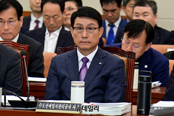 송병억 수도권매립지관리공사 사장이 17일 오전 국회에서 열린 환경노동위원회의 한국수자원공사 등에 대한 국정감사에 출석해 의원 질의를 듣고 있다.