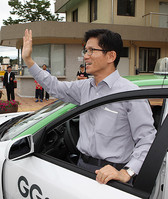 김문수 경기도지사가 18일 이천시에서 28번째 택시체험 후 김 지사는 독거노인과 장애우 등을 택시에 태우고 신륵사와 목아박물관을 관람하는 봉사활동을 했다. 봉사활동에 나서기 전 손을 흔드는 김 지사. ⓒ 뉴데일리“오전 9시부터 운전했는데 5천원밖에 못 벌었다. 큰일이다