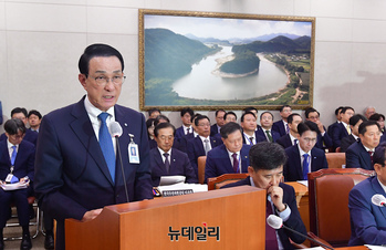 노동진 수산업협동조합중앙회장이 14일 오전 국회 열린 한국해양진흥공사, 수산업협동조합중앙회, 해양환경공단 등에 대한 국정감사에서 인사말을 하고 있다.