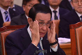 노동진 수산업협동조합중앙회장이 14일 오전 국회 열린 한국해양진흥공사, 수산업협동조합중앙회, 해양환경공단 등에 대한 국정감사에서 안경을 고쳐쓰고 있다.