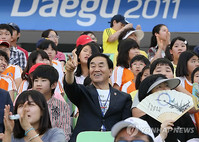 이재오 특임장관이 29일 모교인 경북 영양 석포초등학교 학생들과 함께 대구 세계육상선수권대회 경기를 관람해 눈길을 끌었다.이 장관은 이날 오전 대회가 열리는 대구스타디움으로 석포초등학교 학생과 교직원 41명을 초청, 허들과 원반던지기 등의 경기를 1시간 넘게 함께 관람