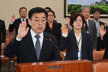 장동언 기상청장이 11일 오전 서울 여의도 국회에서 열린 환경노동위원회의 기상청 등에 대한 국정감사에서 선서를 하고 있다.