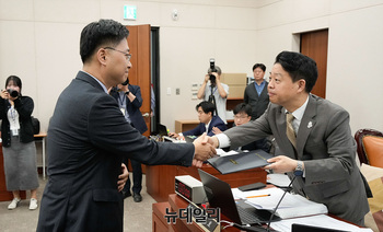 정제영 한국교육학술정보원장이 11일 오전 서울 여의도 국회에서 열린 한국교육학술정보원, 한국고전번역원, 사립학교교직원연금공단 등에 대한 국정감사에서 증인선서를 마치고 김영호 위원장과 악수를 나누고 있다.