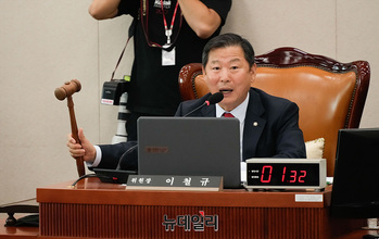 이철규 위원장이 11일 오전 서울 여의도 국회에서 열린 국회 산업통상자원중소벤처기업위원회의 대한무역투자진흥공사, 한국무역보험공사, 한국산업단지공단 등에 대한 국정감사에서 여야 의원간 언쟁이 계속되자 정회를 선언하고 있다.