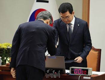 조지호 경찰청장이 11일 오전 서울 서대문구 경찰청에서 열린 국회 행정안전위원회의 경찰청 국정감사에 앞서 선서문을 신정훈 행안위원장에게 전달하고 있다.