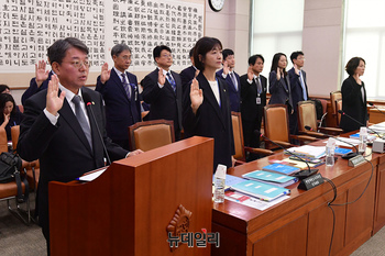 김정원 헌법재판소 사무처장이 11일 오전 국회에서 열린 법제사법위원회 헌법재판소 사무처와 헌법재판연구원에 대한 국정감사에서 선서를 하고 있다.