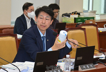 이훈기 더불어민주당 의원이 10일 국회에서 열린 과학기술정보방송통신위원회의 원자력안전위원회 등 국정감사에서 라돈측정기를 들어 보이고 있다.