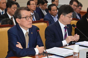 안호영 위원장이 김문수 고용노동부 장관에 퇴장을 요청한 10일 오후 서울 여의도 국회 환경노동위원회의 고용노동부에 대한 국정감사에서 퇴장을 거부한 김문수 장관이 자리를 지키고 있다.