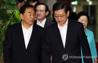 김황식 국무총리가 9일 오전 서울 세종로 정부중앙청사에서 열린 국무회의에 참석하기위해 굳은표정으로 이재오 특임장관과 회의장으로 들어오고 있다.연 이틀 주가가 폭락하자 김황식 국무총리가 우리나라 경제 체질의 근본적인 변화를 주문했다.김 총리는 9일 오전 정부중앙청사에서