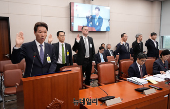 도학영 KT&G 부사장(왼쪽부터), 신정권 티메프사태 비대위원장, 피터얀 반데피트 우아한형제들 대표, 김명규 쿠팡이츠 서비스 대표, 조성호 전 공영홈쇼핑 대표, 양인철 푸드조아 대표가 8일 오후 서울 여의도 국회에서 열린 국회 산업통상자원중소벤처기업위원회의 중소
