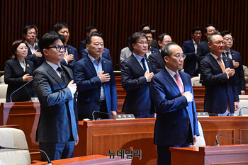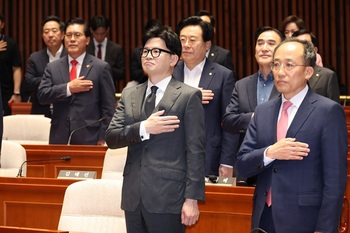 [포토] 국민의례 하는 한동훈 국민의힘 대표