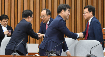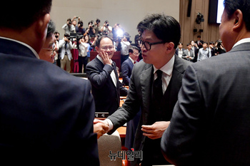 한동훈 국민의힘 대표가 4일 오전 국회에서 열린 의원총회에 참석하며 의원들과 악수를 나누고 있다.